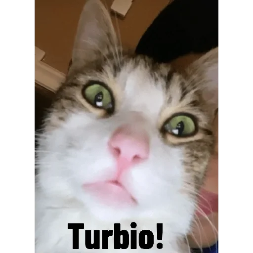 Gato com expressão surpresa e olhos verdes, focinho rosa, texto 'Turbio!' em preto.