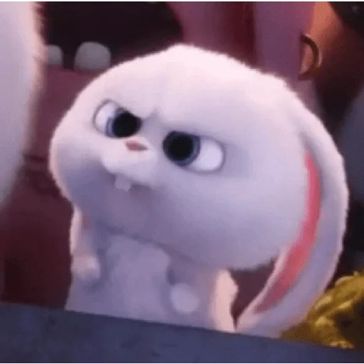 Um coelho branco e fofo com olhos grandes e orelha rosa, parecendo surpreso ou assustado.