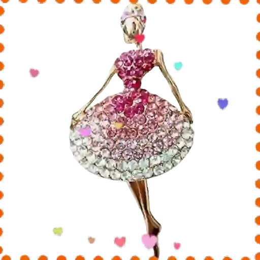 Uma boneca de estilo Barbie vestida com um vestido rosa e branco, cercada de corações coloridos.