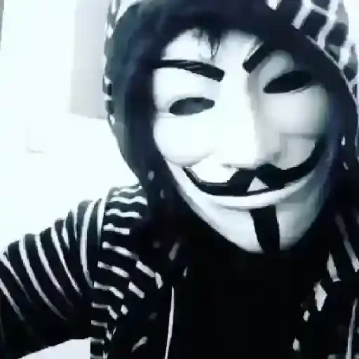 Um homem com máscara branca e preta, vestindo um casaco listrado, com uma expressão facial sorridente e olhos semicerrados.