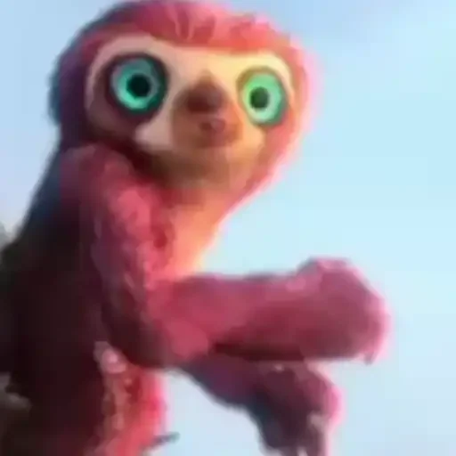 Um monstro rosa com olhos grandes e peludo, parecendo surpreso ou assustado, contra um fundo de céu azul.
