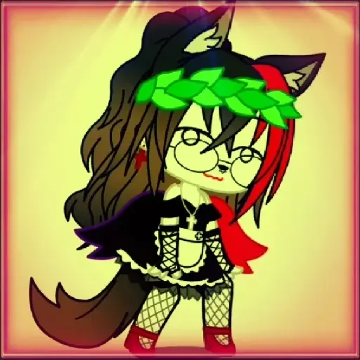 Uma personagem de anime com características de raposa, usando um chapéu preto e uma coroa de folhas verdes, com cabelo castanho e vermelho, óculos e roupa preta com meias de rede.