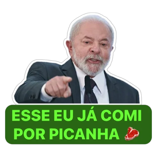 Um homem mais velho com cabelo branco e bigode, vestido com um terno, apontando o dedo e com uma expressão facial séria. Abaixo dele, um retângulo verde com o texto 'ESSE EU JÁ COMI POR PICANHA'.