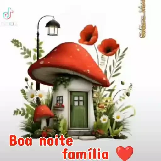 Uma pequena casa em forma de cogumelo com uma porta verde e uma janela, rodeada de flores e folhagem. O texto 'Boa noite família' está escrito em vermelho na parte inferior.