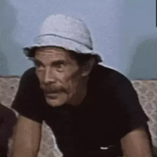 Homem com expressão surpresa, vestindo um chapéu branco e uma camiseta preta.