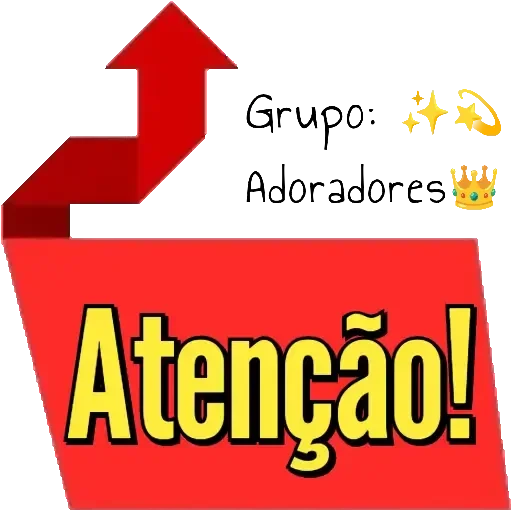 Um retângulo vermelho com a palavra 'Atenção!' em amarelo. Acima, uma seta vermelha apontando para cima e o texto 'Grupo: Adoradores' com emojis de estrela e coroa.