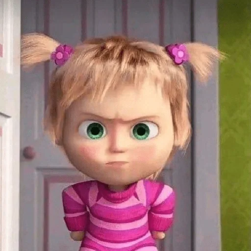 Menina de olhos verdes e cabelos ruivos em pigtails, vestindo uma camisa rosa listrada, com expressão facial séria.