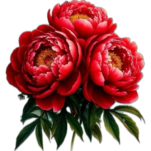Três flores de peônia vermelhas com folhas verdes.