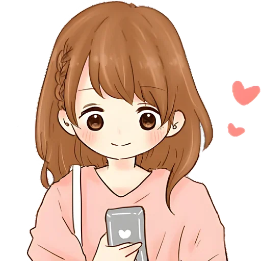 Garota de cabelos castanhos e olhos castanhos, usando um suéter rosa, segura um celular com um coração na tela. Corações rosas flutuam ao lado dela.