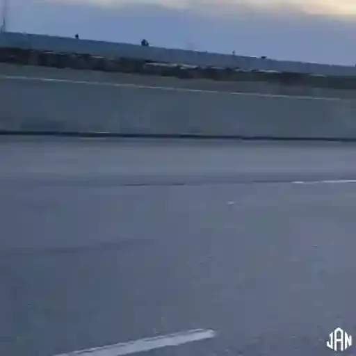 Uma estrada asfaltada com uma barreira de concreto ao lado, sob um céu azul com nuvens.