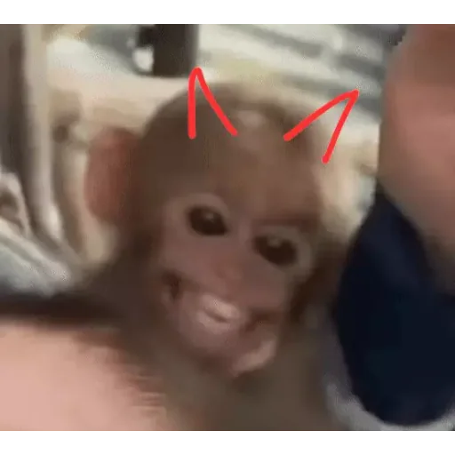 Um macaco com olhos grandes e sorriso, usando chifres vermelhos, ao lado de uma pessoa.