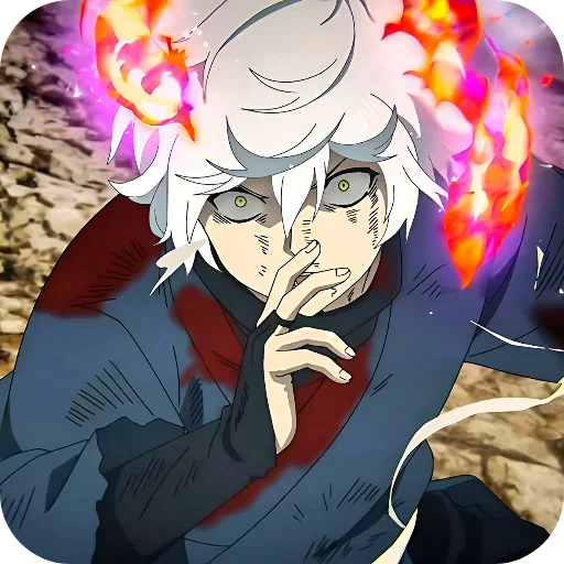 Personagem de anime com cabelo branco e olhos fechados, tocando o queixo com a mão. Chamas coloridas saem de sua cabeça.