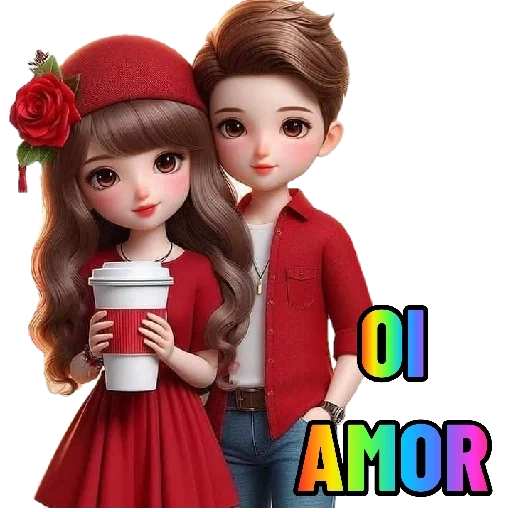 Um casal de personagens de anime, uma menina com chapéu vermelho e rosa na cabeça, segurando um copo de café, e um menino com camisa vermelha e cabelo castanho. Abaixo deles, as palavras 'OI AMOR' coloridas.