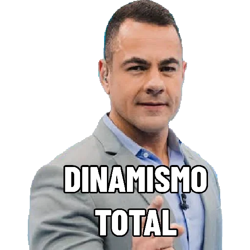 Um homem de meia-idade com um sorriso confiante, usando um blazer cinza e uma camisa azul, aponta para o espectador com a legenda 'DINAMISMO TOTAL' em letras brancas com contorno preto.