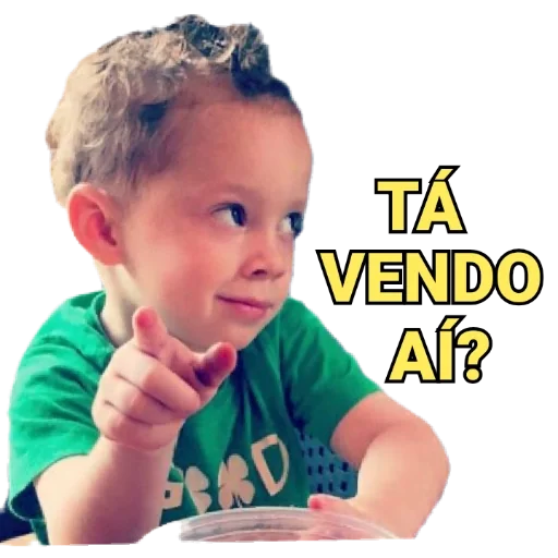 Menino loiro com uma expressão curiosa, apontando o dedo indicador para algo fora da imagem, com o texto 'TÁ VENDO AÍ?' em letras amarelas com contorno preto.