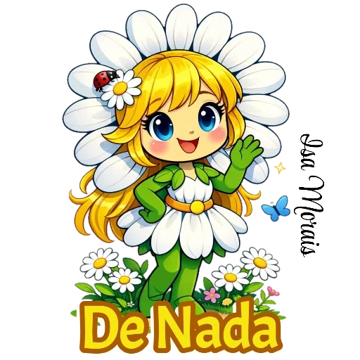 Uma menina de cabelos loiros com uma flor na cabeça e uma grande flor de margarida no lugar de uma saia. Ela tem um sorriso no rosto e a mão levantada. Abaixo dela, há mais flores e a frase 'De Nada' escrita em letras grandes.