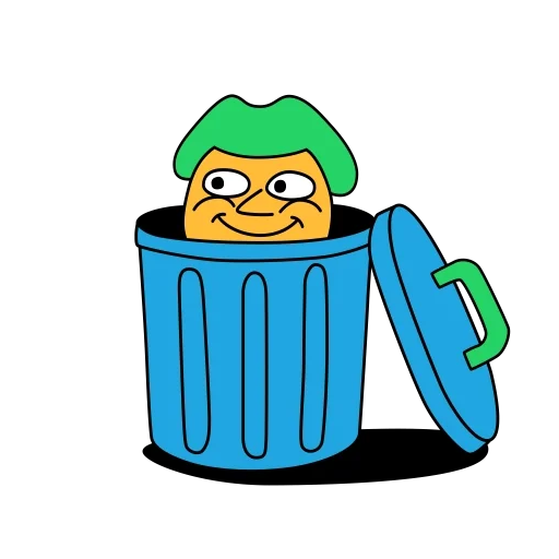 Um personagem amarelo com cabelo verde e olhos grandes está saindo de uma lixeira azul com uma tampa verde. Ele tem um sorriso no rosto.