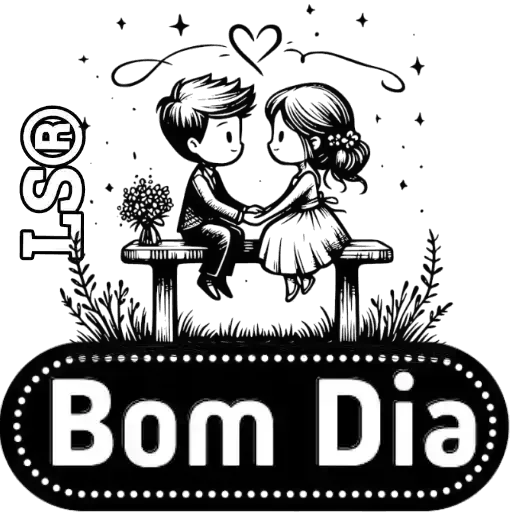 Um casal de namorados sentados em um banco, com um coração acima deles e a frase 'Bom Dia' abaixo. O casal é desenhado em estilo cartoon.