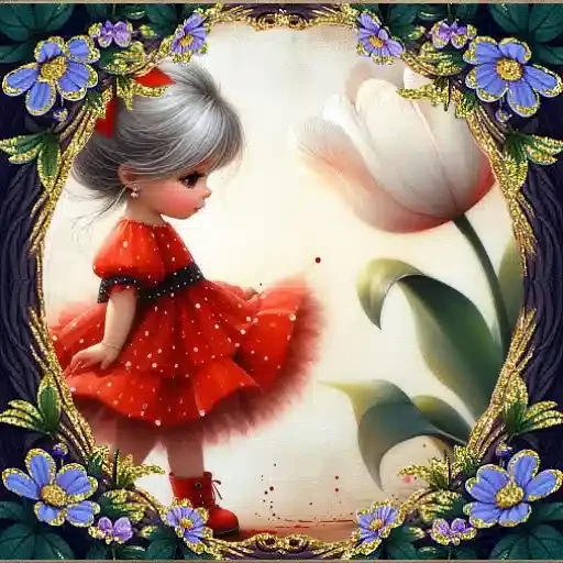 Menina de cabelo grisalho e vestido vermelho ao lado de uma tulipa rosa, emoldurada por flores azuis e amarelas.
