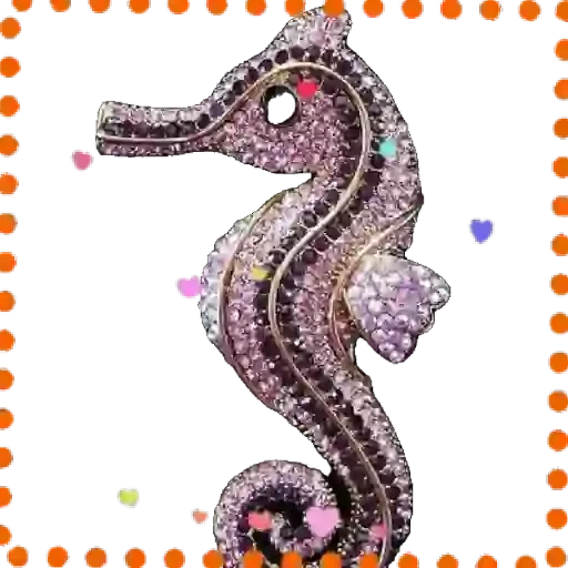 Um cavalo-marinho roxo decorado com pedras brilhantes e corações coloridos, em um fundo branco com uma borda de pontos laranja.