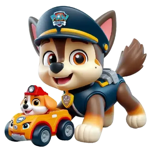 Dois cachorros fofos vestidos como policiais e bombeiros, Chase e Marshall de PAW Patrol, com expressão feliz e…