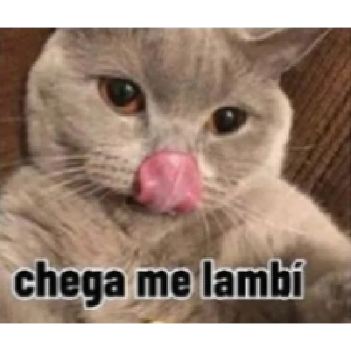 Gato cinza com a língua rosa para fora, texto 'chega me lambí'.