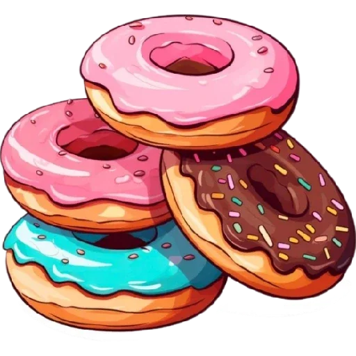 Três donuts empilhados com coberturas de cores diferentes: um rosa com confeitos, um azul e outro de chocolate com confeitos coloridos.
