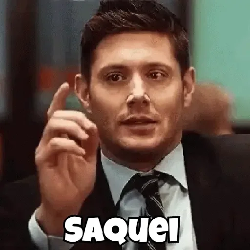 Homem de terno e gravata, com a mão levantada e dedo indicador apontado. Ele tem cabelo preto e parece estar falando. A palavra 'SAQUEL' está escrita em branco na parte inferior.