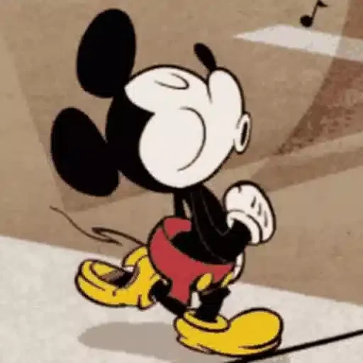 Mickey Mouse dançando com um sorriso no rosto, usando shorts vermelhos e sapatos amarelos, com uma expressão feliz.
