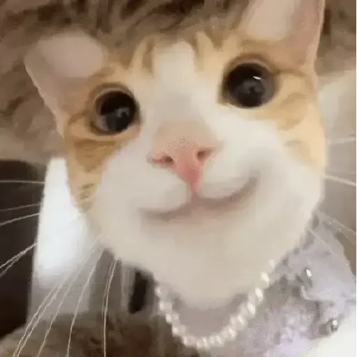 Gato com olhos arregalados e colar de pérolas, parecendo surpreso ou assustado, com focinho rosa e orelhas pointed.