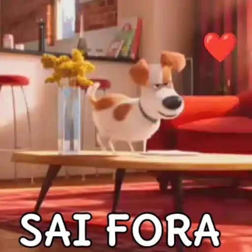 Um cachorro branco com manchas marrons em pé ao lado de uma mesa com um vaso de flores, com o texto 'SAI FORA' em letras grandes.