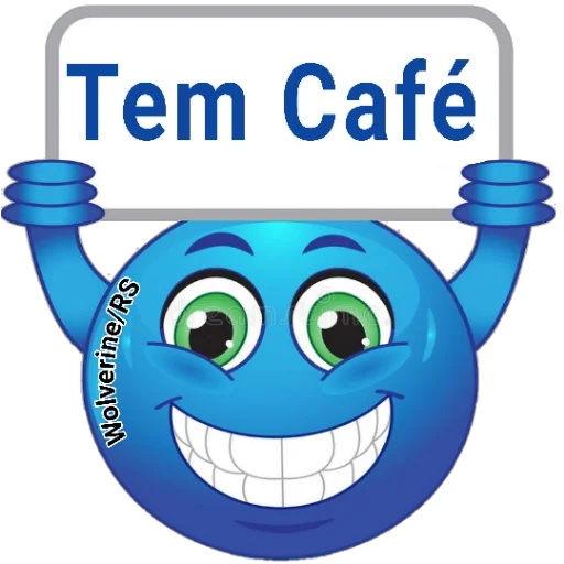 Um personagem azul sorridente com olhos verdes e um grande sorriso, segurando uma placa que diz 'Tem Café'.
