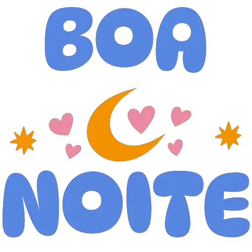 Uma lua crescente amarela com corações rosa e estrelas laranja ao redor, com o texto 'BOA NOITE' em azul.