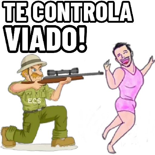 Um homem de óculos e chapéu, vestido com roupas de caça, aponta uma arma para uma mulher de vestido rosa que parece assustada. O texto 'TE CONTROLA VIADO!' aparece acima deles.