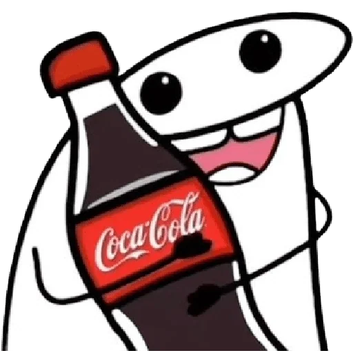 Um desenho de um personagem cartoon com uma garrafa de Coca-Cola, com um sorriso e olhos grandes.