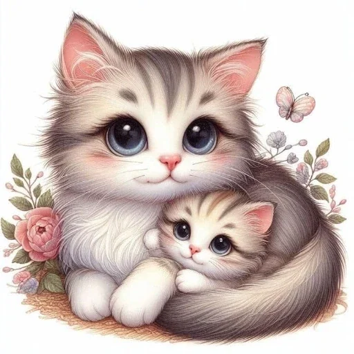 Dois gatinhos fofos, um maior e um menor, abraçados com flores e borboletas ao redor. Os gatinhos têm olhos grandes e expressivos.