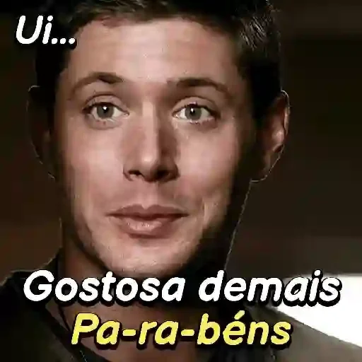 Um homem com expressão surpresa e olhos arregalados, com o texto 'Ui...' na parte superior esquerda e 'Gostosa demais Pa-ra-béns' na parte inferior.