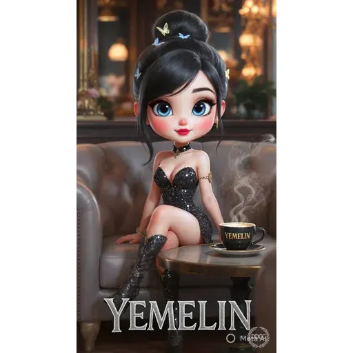 Uma menina de olhos azuis e cabelos pretos sentada num sofá com um bule de café, vestindo uma roupa preta. Ela tem uma expressão suave e está num ambiente aconchegante. Abaixo dela, está escrito 'YEMELIN'