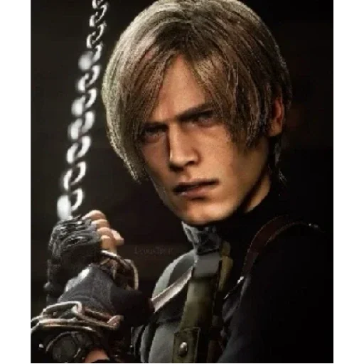 Personagem de jogo com cabelo castanho claro e olhos sérios, vestindo roupas pretas e segurando correntes.