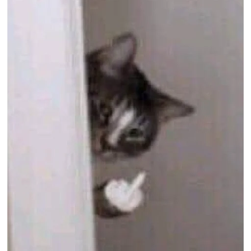 Gato cinza com marca branca no focinho espiando de trás de uma porta.