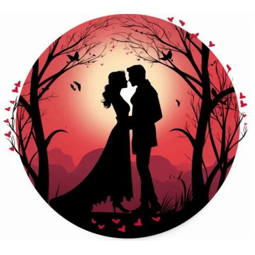 Um casal se beijando em silueta contra um pôr do sol vermelho, com árvores sem folhas e folhas vermelhas ao redor.
