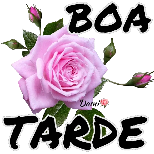 Uma rosa rosa com folhas verdes e botões de rosa, com o texto 'BOA TARDE' em letras pretas grandes. O fundo é branco.