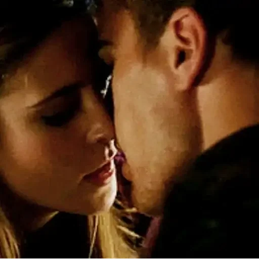 Um homem beijando o pescoço de uma mulher com os olhos fechados, ambos com expressões de intimidade.