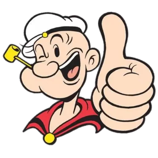 Popeye, o marinheiro, com um sorriso largo e o polegar para cima, segurando um cachimbo na boca.