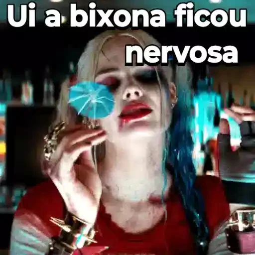 Uma mulher loira com uma expressão facial exagerada e um objeto azul na frente do rosto, com o texto 'Ui a bixona ficou nervosa' sobreposto.