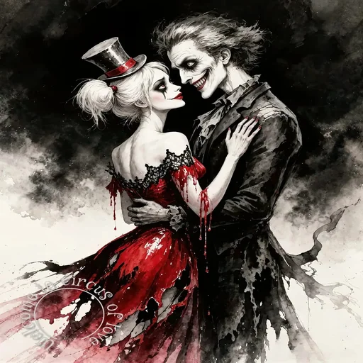 Um casal, aparentemente o Joker e Harley Quinn, representados em um estilo sombrio e fumacê com traços de maquiagem…