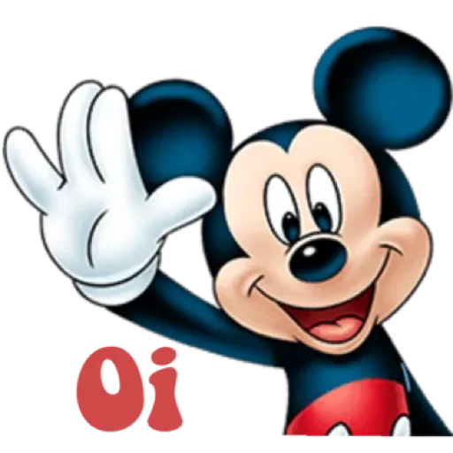 Mickey Mouse acenando com a mão e sorrindo, com a palavra 'Oi' em vermelho ao lado.