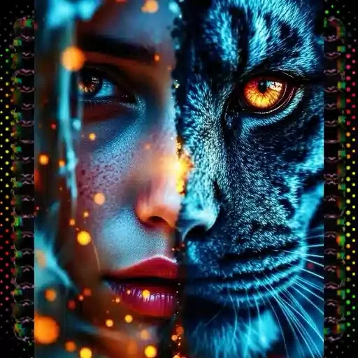 Rosto de uma mulher ao lado do rosto de um tigre, com olhos brilhantes e efeitos de luz. A imagem tem tons de azul e laranja.