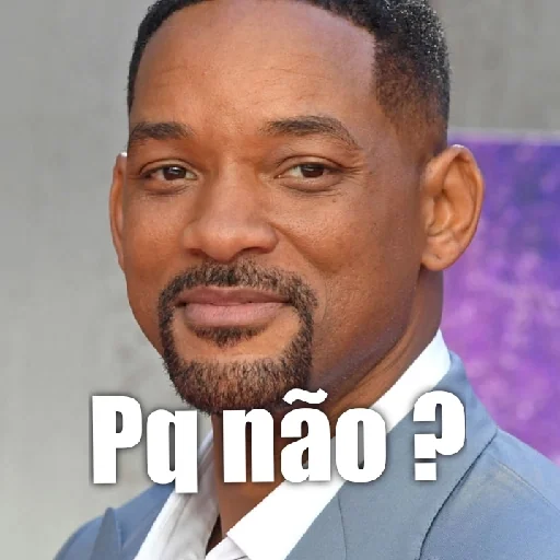 Rosto de Will Smith com bigode e barba, vestindo um blazer azul e camisa branca, com o texto 'Pq não?' sobreposto.