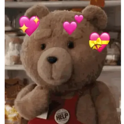 Um ursinho de pelúcia marrom com um colete vermelho que tem a palavra 'HELP' em um círculo branco. Ele tem vários corações rosa e amarelos sobre a cabeça.